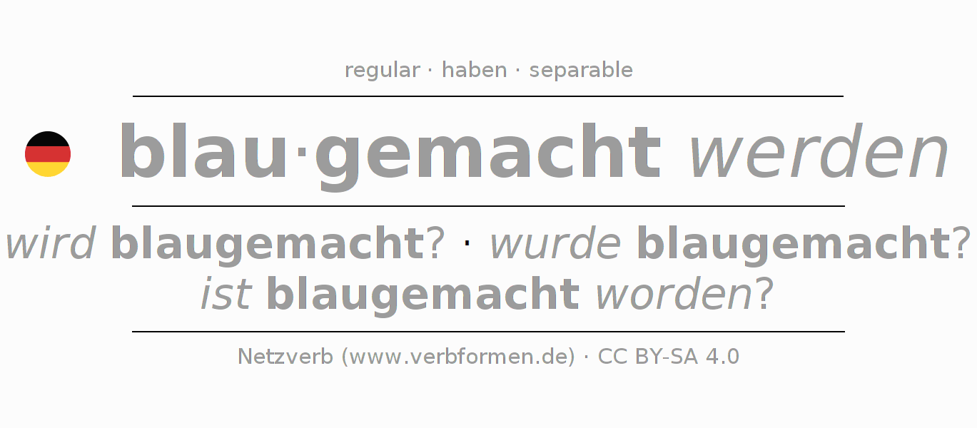 Ejemplos para la conjugación del infinitivo blaumachen. Aquí tenemos fragmentos de texto reales y oraciones tomadas del proyecto Tatoeba. Por cada tipo de conjugación hay un ejemplo y la forma verbal se encuentra destacada. A veces hay más de una oración, pero en ese caso se seleccionará automáticamente un ejemplo del verbo alemán en cuestión. Para que además de aprender también practiques la conjugación del verbo, tenemos para ti Arbeitsblätter und Übungen hojas de trabajo disponibles.