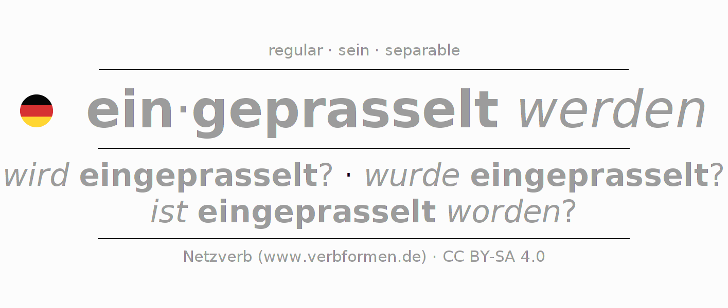 Ejemplos para la conjugación del infinitivo einprasseln. Aquí tenemos fragmentos de texto reales y oraciones tomadas del proyecto Tatoeba. Por cada tipo de conjugación hay un ejemplo y la forma verbal se encuentra destacada. A veces hay más de una oración, pero en ese caso se seleccionará automáticamente un ejemplo del verbo alemán en cuestión. Para que además de aprender también practiques la conjugación del verbo, tenemos para ti Arbeitsblätter und Übungen hojas de trabajo disponibles.