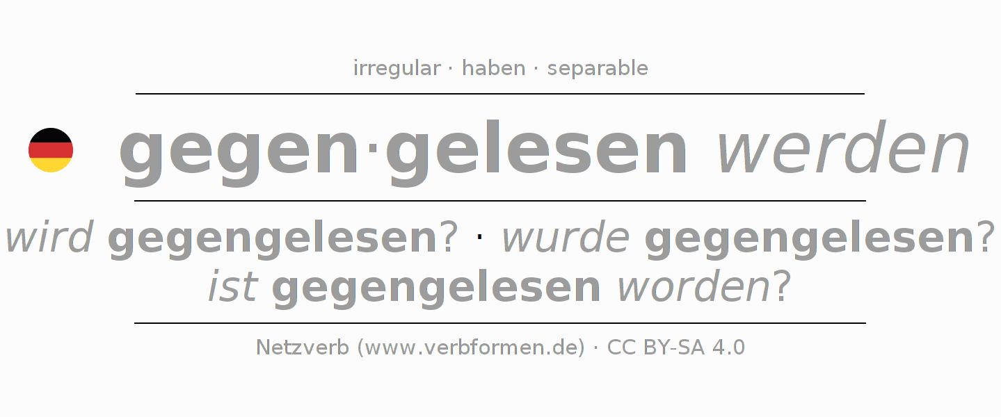 Ejemplos para la conjugación del infinitivo gegenlesen. Aquí tenemos fragmentos de texto reales y oraciones tomadas del proyecto Tatoeba. Por cada tipo de conjugación hay un ejemplo y la forma verbal se encuentra destacada. A veces hay más de una oración, pero en ese caso se seleccionará automáticamente un ejemplo del verbo alemán en cuestión. Para que además de aprender también practiques la conjugación del verbo, tenemos para ti Arbeitsblätter und Übungen hojas de trabajo disponibles.