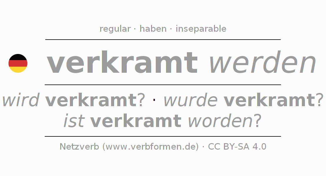Ejemplos para la conjugación del infinitivo verkramen. Aquí tenemos fragmentos de texto reales y oraciones tomadas del proyecto Tatoeba. Por cada tipo de conjugación hay un ejemplo y la forma verbal se encuentra destacada. A veces hay más de una oración, pero en ese caso se seleccionará automáticamente un ejemplo del verbo alemán en cuestión. Para que además de aprender también practiques la conjugación del verbo, tenemos para ti Arbeitsblätter und Übungen hojas de trabajo disponibles.