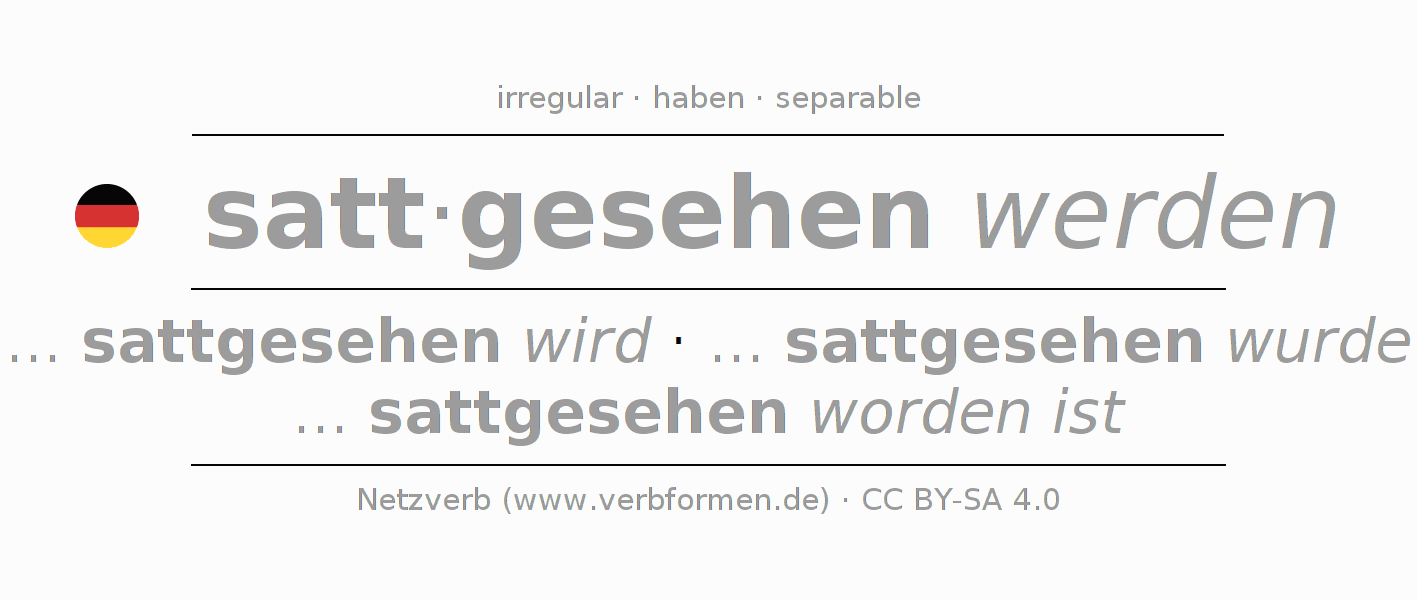 Ejemplos para la conjugación del infinitivo sattsehen. Aquí tenemos fragmentos de texto reales y oraciones tomadas del proyecto Tatoeba. Por cada tipo de conjugación hay un ejemplo y la forma verbal se encuentra destacada. A veces hay más de una oración, pero en ese caso se seleccionará automáticamente un ejemplo del verbo alemán en cuestión. Para que además de aprender también practiques la conjugación del verbo, tenemos para ti Arbeitsblätter und Übungen hojas de trabajo disponibles.