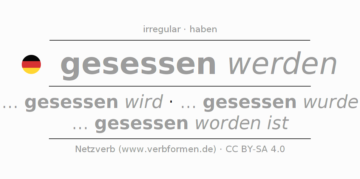 Ejemplos para la conjugación del infinitivo sitzen. Aquí tenemos fragmentos de texto reales y oraciones tomadas del proyecto Tatoeba. Por cada tipo de conjugación hay un ejemplo y la forma verbal se encuentra destacada. A veces hay más de una oración, pero en ese caso se seleccionará automáticamente un ejemplo del verbo alemán en cuestión. Para que además de aprender también practiques la conjugación del verbo, tenemos para ti Arbeitsblätter und Übungen hojas de trabajo disponibles.