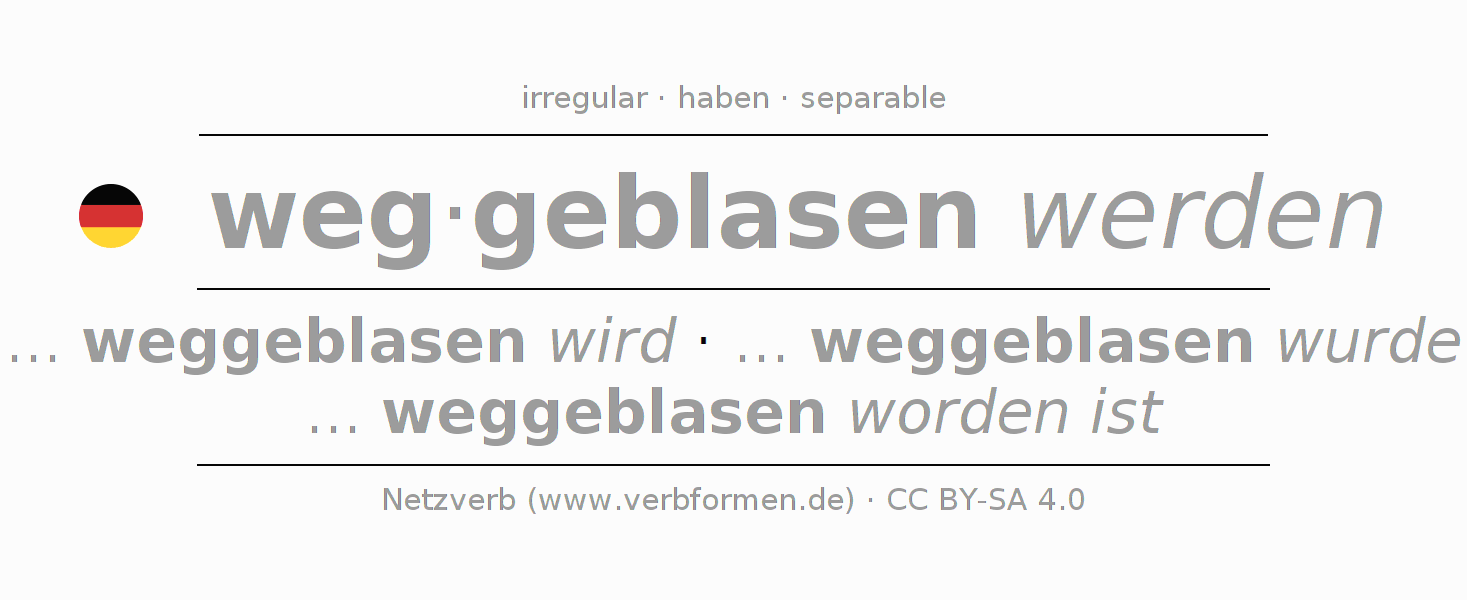 Ejemplos para la conjugación del infinitivo wegblasen. Aquí tenemos fragmentos de texto reales y oraciones tomadas del proyecto Tatoeba. Por cada tipo de conjugación hay un ejemplo y la forma verbal se encuentra destacada. A veces hay más de una oración, pero en ese caso se seleccionará automáticamente un ejemplo del verbo alemán en cuestión. Para que además de aprender también practiques la conjugación del verbo, tenemos para ti Arbeitsblätter und Übungen hojas de trabajo disponibles.