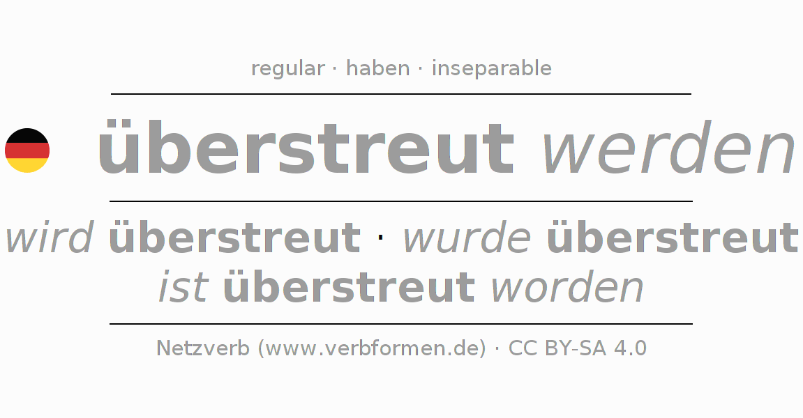 Ejemplos para la conjugación del infinitivo überstreuen. Aquí tenemos fragmentos de texto reales y oraciones tomadas del proyecto Tatoeba. Por cada tipo de conjugación hay un ejemplo y la forma verbal se encuentra destacada. A veces hay más de una oración, pero en ese caso se seleccionará automáticamente un ejemplo del verbo alemán en cuestión. Para que además de aprender también practiques la conjugación del verbo, tenemos para ti Arbeitsblätter und Übungen hojas de trabajo disponibles.