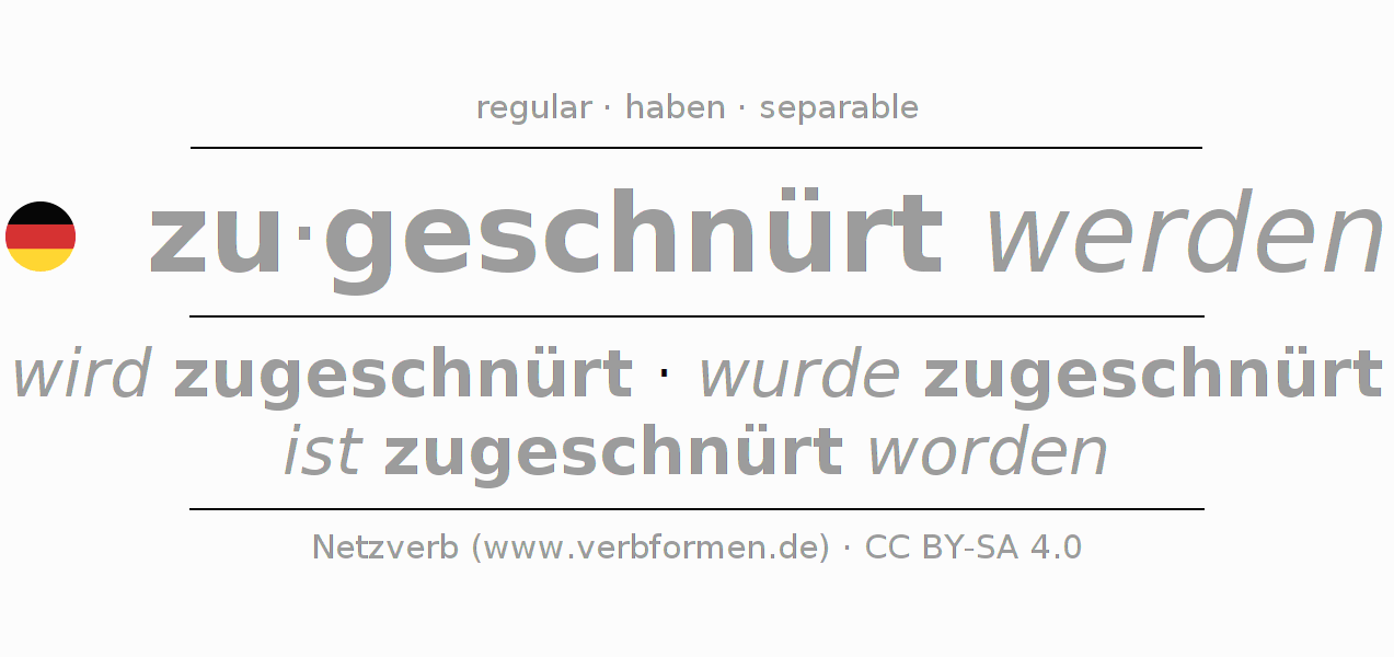 Ejemplos para la conjugación del infinitivo zuschnüren. Aquí tenemos fragmentos de texto reales y oraciones tomadas del proyecto Tatoeba. Por cada tipo de conjugación hay un ejemplo y la forma verbal se encuentra destacada. A veces hay más de una oración, pero en ese caso se seleccionará automáticamente un ejemplo del verbo alemán en cuestión. Para que además de aprender también practiques la conjugación del verbo, tenemos para ti Arbeitsblätter und Übungen hojas de trabajo disponibles.