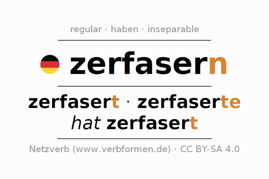 Ejemplos para la conjugación del infinitivo zerfasern. Aquí tenemos fragmentos de texto reales y oraciones tomadas del proyecto Tatoeba. Por cada tipo de conjugación hay un ejemplo y la forma verbal se encuentra destacada. A veces hay más de una oración, pero en ese caso se seleccionará automáticamente un ejemplo del verbo alemán en cuestión. Para que además de aprender también practiques la conjugación del verbo, tenemos para ti Arbeitsblätter und Übungen hojas de trabajo disponibles.