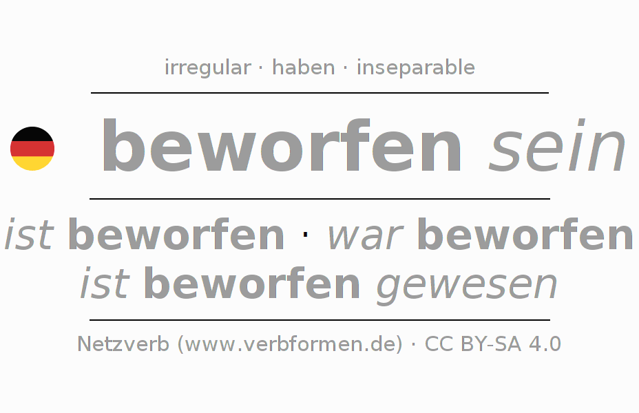 Ejemplos para la conjugación del infinitivo bewerfen. Aquí tenemos fragmentos de texto reales y oraciones tomadas del proyecto Tatoeba. Por cada tipo de conjugación hay un ejemplo y la forma verbal se encuentra destacada. A veces hay más de una oración, pero en ese caso se seleccionará automáticamente un ejemplo del verbo alemán en cuestión. Para que además de aprender también practiques la conjugación del verbo, tenemos para ti Arbeitsblätter und Übungen hojas de trabajo disponibles.
