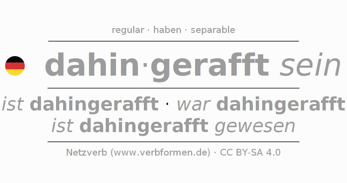 Ejemplos para la conjugación del infinitivo dahinraffen. Aquí tenemos fragmentos de texto reales y oraciones tomadas del proyecto Tatoeba. Por cada tipo de conjugación hay un ejemplo y la forma verbal se encuentra destacada. A veces hay más de una oración, pero en ese caso se seleccionará automáticamente un ejemplo del verbo alemán en cuestión. Para que además de aprender también practiques la conjugación del verbo, tenemos para ti Arbeitsblätter und Übungen hojas de trabajo disponibles.