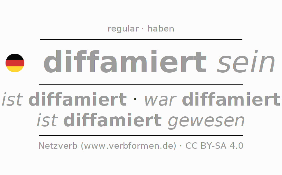 Ejemplos para la conjugación del infinitivo diffamieren. Aquí tenemos fragmentos de texto reales y oraciones tomadas del proyecto Tatoeba. Por cada tipo de conjugación hay un ejemplo y la forma verbal se encuentra destacada. A veces hay más de una oración, pero en ese caso se seleccionará automáticamente un ejemplo del verbo alemán en cuestión. Para que además de aprender también practiques la conjugación del verbo, tenemos para ti Arbeitsblätter und Übungen hojas de trabajo disponibles.