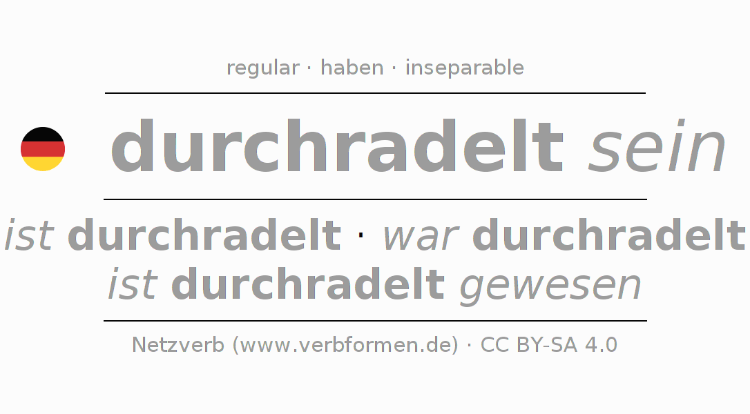 Ejemplos para la conjugación del infinitivo durchradeln. Aquí tenemos fragmentos de texto reales y oraciones tomadas del proyecto Tatoeba. Por cada tipo de conjugación hay un ejemplo y la forma verbal se encuentra destacada. A veces hay más de una oración, pero en ese caso se seleccionará automáticamente un ejemplo del verbo alemán en cuestión. Para que además de aprender también practiques la conjugación del verbo, tenemos para ti Arbeitsblätter und Übungen hojas de trabajo disponibles.