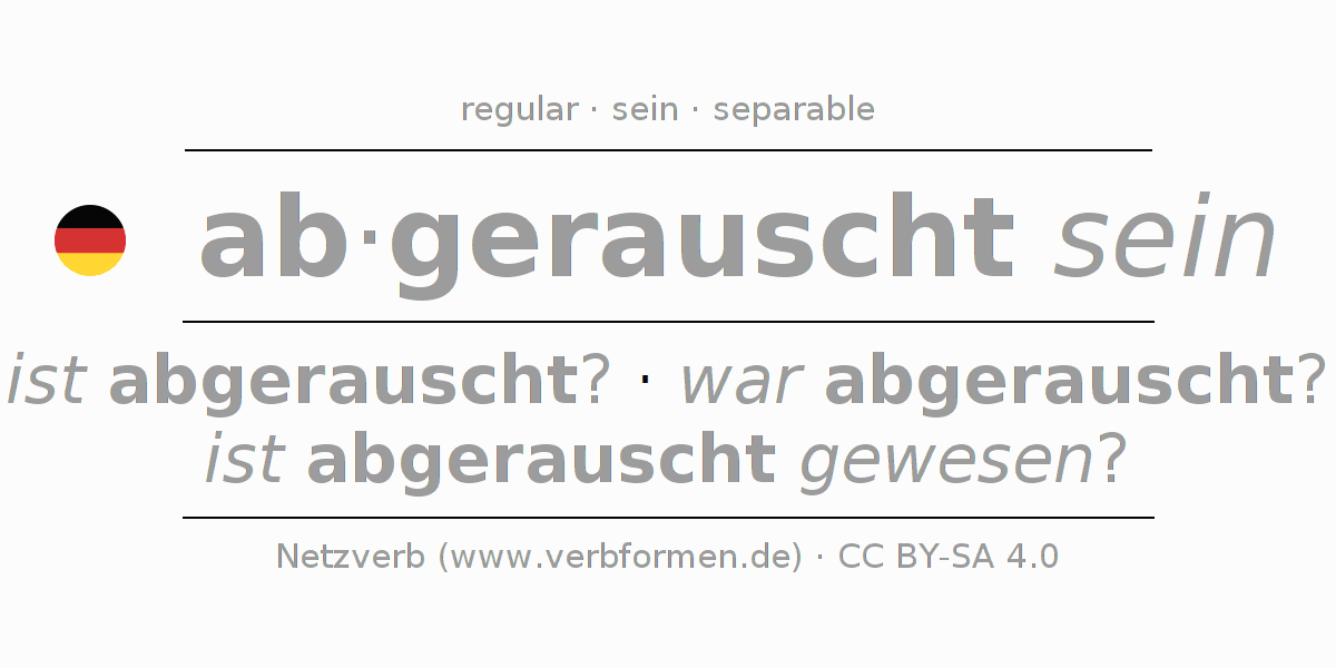 Ejemplos para la conjugación del infinitivo abrauschen. Aquí tenemos fragmentos de texto reales y oraciones tomadas del proyecto Tatoeba. Por cada tipo de conjugación hay un ejemplo y la forma verbal se encuentra destacada. A veces hay más de una oración, pero en ese caso se seleccionará automáticamente un ejemplo del verbo alemán en cuestión. Para que además de aprender también practiques la conjugación del verbo, tenemos para ti Arbeitsblätter und Übungen hojas de trabajo disponibles.