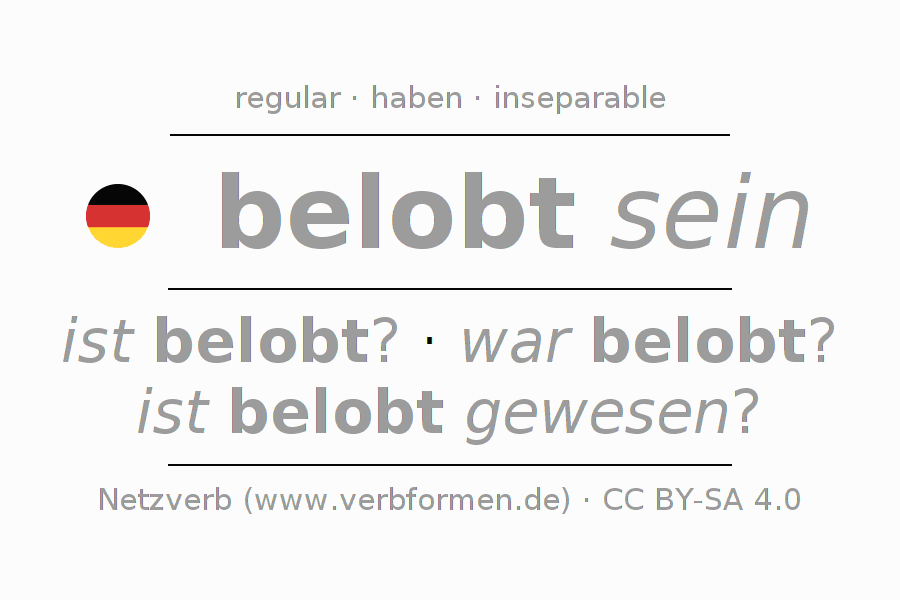 Ejemplos para la conjugación del infinitivo beloben. Aquí tenemos fragmentos de texto reales y oraciones tomadas del proyecto Tatoeba. Por cada tipo de conjugación hay un ejemplo y la forma verbal se encuentra destacada. A veces hay más de una oración, pero en ese caso se seleccionará automáticamente un ejemplo del verbo alemán en cuestión. Para que además de aprender también practiques la conjugación del verbo, tenemos para ti Arbeitsblätter und Übungen hojas de trabajo disponibles.