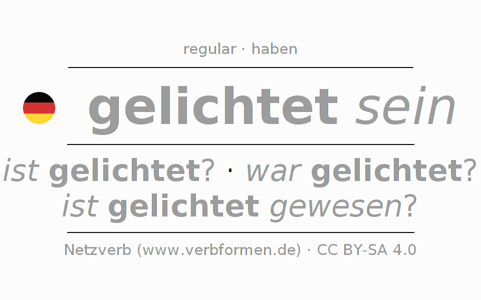 Ejemplos para la conjugación del infinitivo lichten. Aquí tenemos fragmentos de texto reales y oraciones tomadas del proyecto Tatoeba. Por cada tipo de conjugación hay un ejemplo y la forma verbal se encuentra destacada. A veces hay más de una oración, pero en ese caso se seleccionará automáticamente un ejemplo del verbo alemán en cuestión. Para que además de aprender también practiques la conjugación del verbo, tenemos para ti Arbeitsblätter und Übungen hojas de trabajo disponibles.