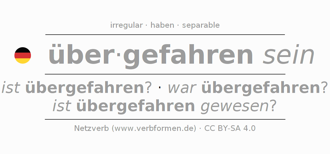 Ejemplos para la conjugación del infinitivo überfahren. Aquí tenemos fragmentos de texto reales y oraciones tomadas del proyecto Tatoeba. Por cada tipo de conjugación hay un ejemplo y la forma verbal se encuentra destacada. A veces hay más de una oración, pero en ese caso se seleccionará automáticamente un ejemplo del verbo alemán en cuestión. Para que además de aprender también practiques la conjugación del verbo, tenemos para ti Arbeitsblätter und Übungen hojas de trabajo disponibles.