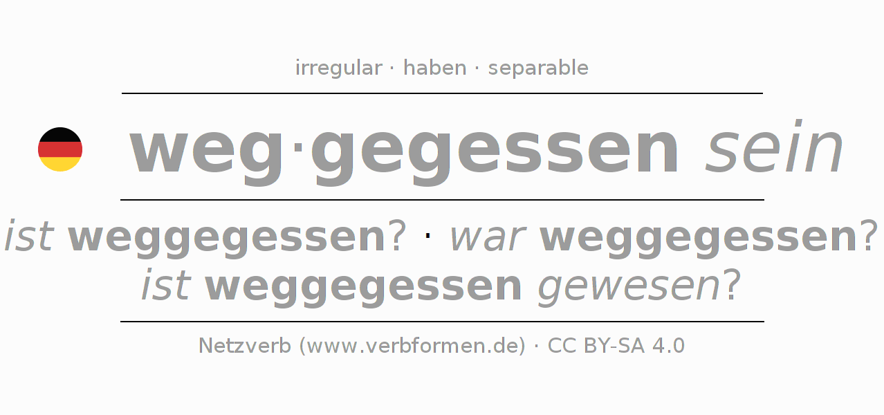 Ejemplos para la conjugación del infinitivo wegessen. Aquí tenemos fragmentos de texto reales y oraciones tomadas del proyecto Tatoeba. Por cada tipo de conjugación hay un ejemplo y la forma verbal se encuentra destacada. A veces hay más de una oración, pero en ese caso se seleccionará automáticamente un ejemplo del verbo alemán en cuestión. Para que además de aprender también practiques la conjugación del verbo, tenemos para ti Arbeitsblätter und Übungen hojas de trabajo disponibles.