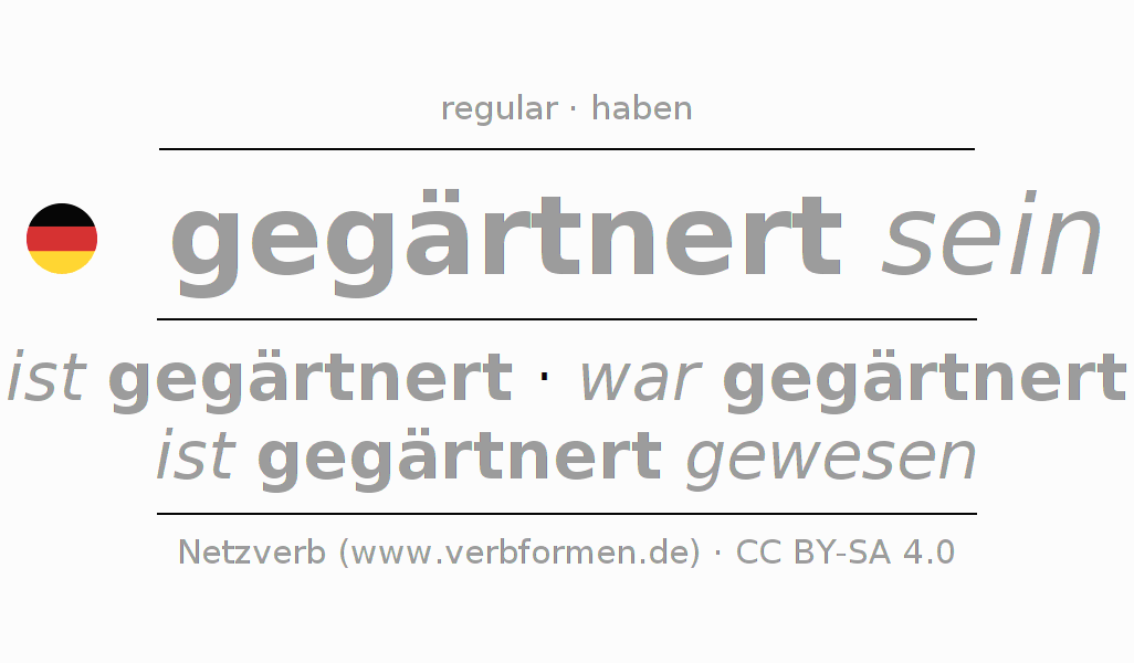 Ejemplos para la conjugación del infinitivo gärtnern. Aquí tenemos fragmentos de texto reales y oraciones tomadas del proyecto Tatoeba. Por cada tipo de conjugación hay un ejemplo y la forma verbal se encuentra destacada. A veces hay más de una oración, pero en ese caso se seleccionará automáticamente un ejemplo del verbo alemán en cuestión. Para que además de aprender también practiques la conjugación del verbo, tenemos para ti Arbeitsblätter und Übungen hojas de trabajo disponibles.
