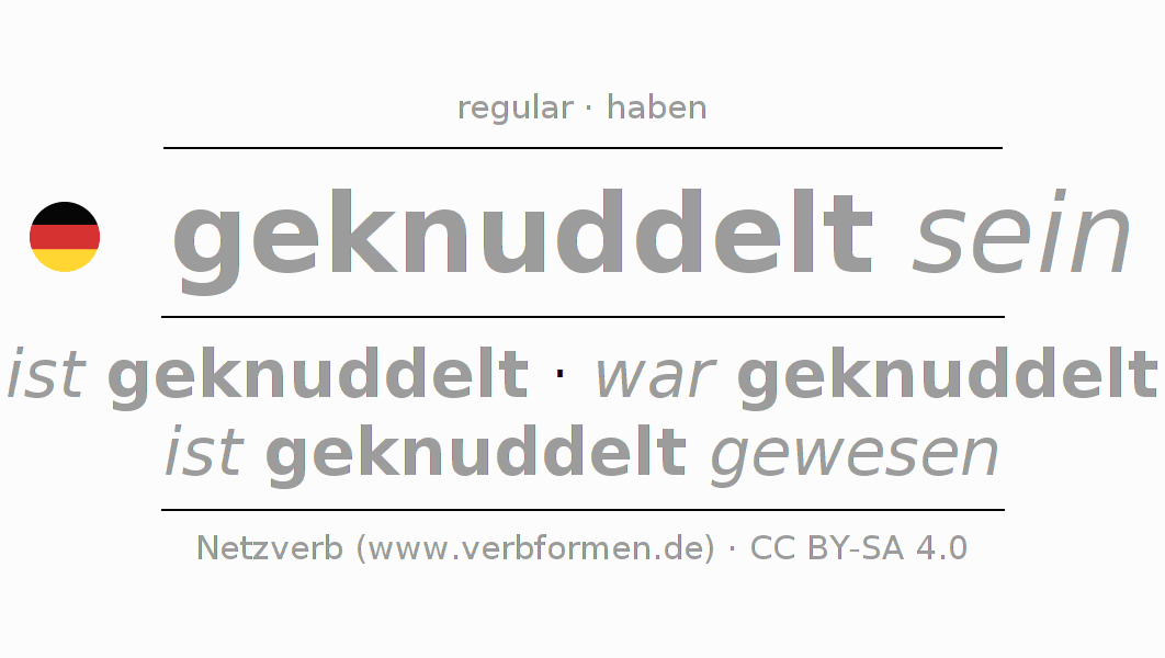 Ejemplos para la conjugación del infinitivo knuddeln. Aquí tenemos fragmentos de texto reales y oraciones tomadas del proyecto Tatoeba. Por cada tipo de conjugación hay un ejemplo y la forma verbal se encuentra destacada. A veces hay más de una oración, pero en ese caso se seleccionará automáticamente un ejemplo del verbo alemán en cuestión. Para que además de aprender también practiques la conjugación del verbo, tenemos para ti Arbeitsblätter und Übungen hojas de trabajo disponibles.