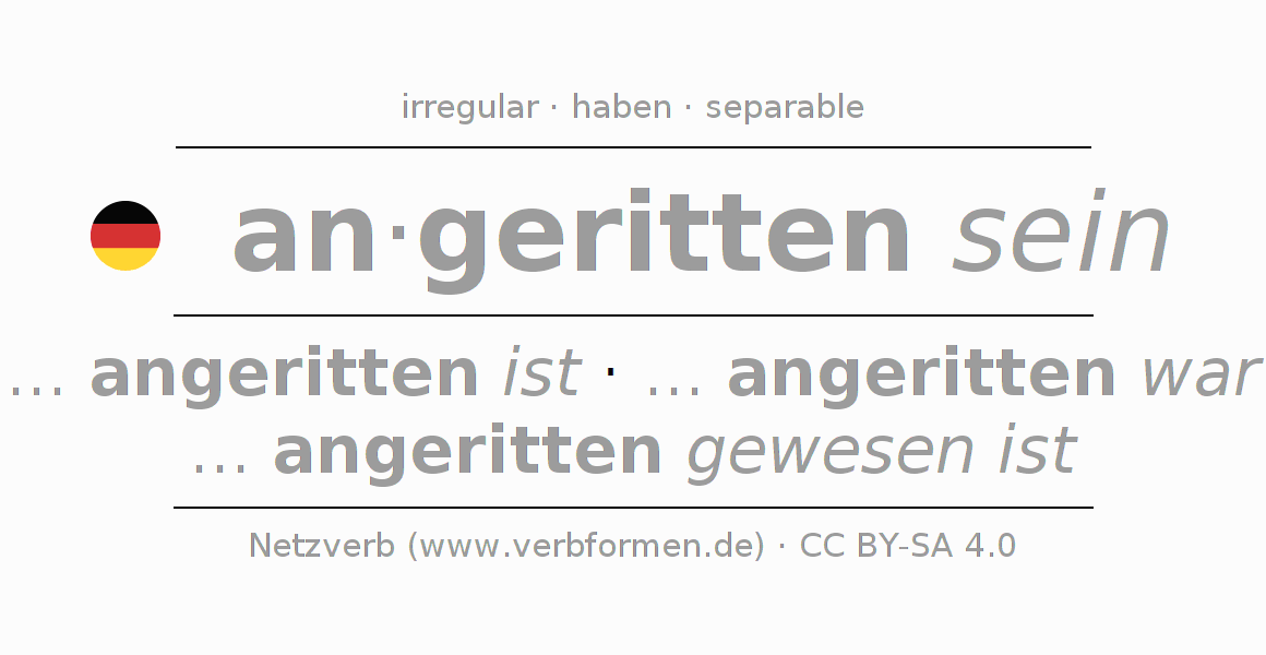 Ejemplos para la conjugación del infinitivo anreiten. Aquí tenemos fragmentos de texto reales y oraciones tomadas del proyecto Tatoeba. Por cada tipo de conjugación hay un ejemplo y la forma verbal se encuentra destacada. A veces hay más de una oración, pero en ese caso se seleccionará automáticamente un ejemplo del verbo alemán en cuestión. Para que además de aprender también practiques la conjugación del verbo, tenemos para ti Arbeitsblätter und Übungen hojas de trabajo disponibles.