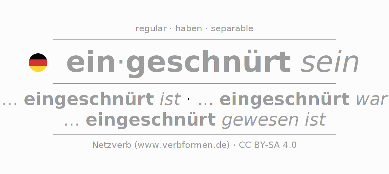 Ejemplos para la conjugación del infinitivo einschnüren. Aquí tenemos fragmentos de texto reales y oraciones tomadas del proyecto Tatoeba. Por cada tipo de conjugación hay un ejemplo y la forma verbal se encuentra destacada. A veces hay más de una oración, pero en ese caso se seleccionará automáticamente un ejemplo del verbo alemán en cuestión. Para que además de aprender también practiques la conjugación del verbo, tenemos para ti Arbeitsblätter und Übungen hojas de trabajo disponibles.