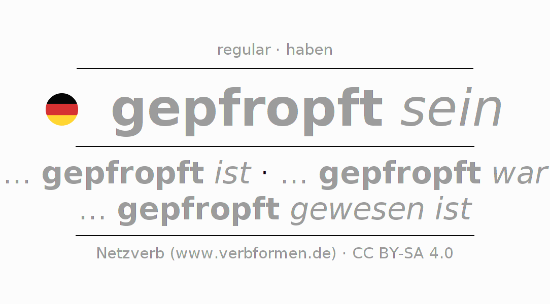 Ejemplos para la conjugación del infinitivo pfropfen. Aquí tenemos fragmentos de texto reales y oraciones tomadas del proyecto Tatoeba. Por cada tipo de conjugación hay un ejemplo y la forma verbal se encuentra destacada. A veces hay más de una oración, pero en ese caso se seleccionará automáticamente un ejemplo del verbo alemán en cuestión. Para que además de aprender también practiques la conjugación del verbo, tenemos para ti Arbeitsblätter und Übungen hojas de trabajo disponibles.