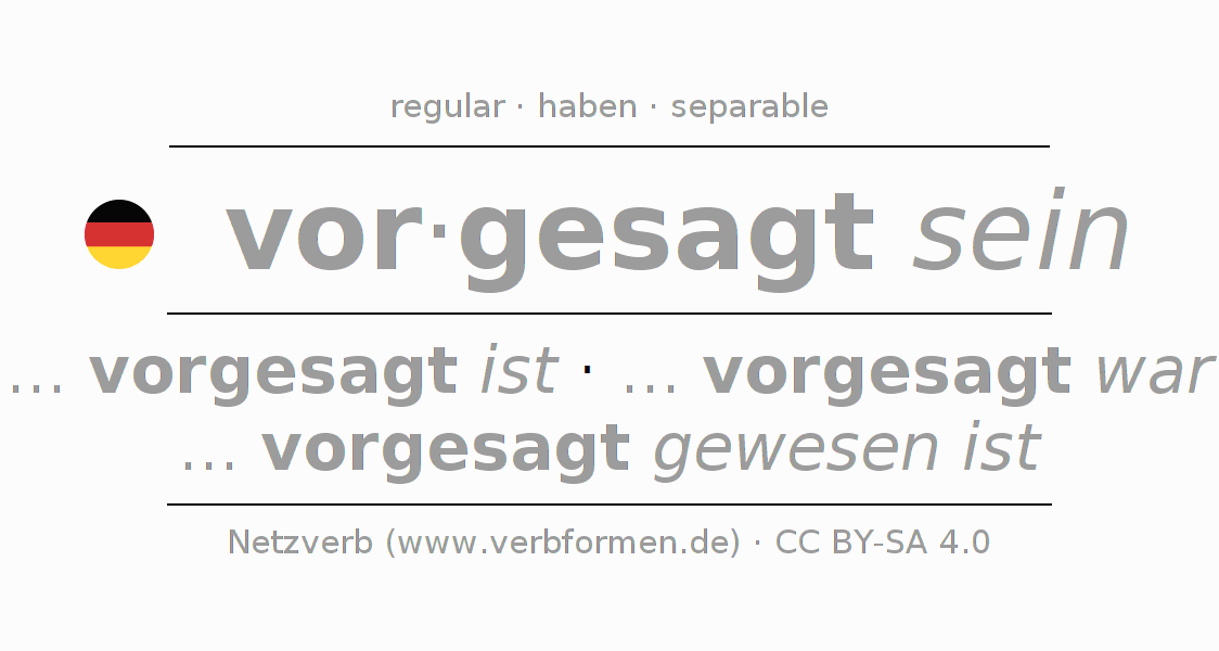 Ejemplos para la conjugación del infinitivo vorsagen. Aquí tenemos fragmentos de texto reales y oraciones tomadas del proyecto Tatoeba. Por cada tipo de conjugación hay un ejemplo y la forma verbal se encuentra destacada. A veces hay más de una oración, pero en ese caso se seleccionará automáticamente un ejemplo del verbo alemán en cuestión. Para que además de aprender también practiques la conjugación del verbo, tenemos para ti Arbeitsblätter und Übungen hojas de trabajo disponibles.