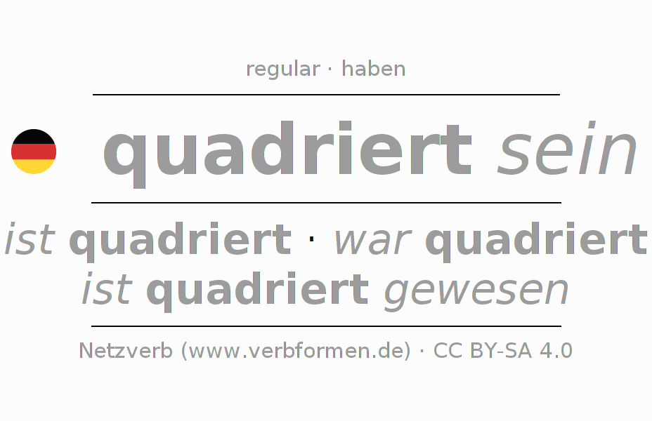 Ejemplos para la conjugación del infinitivo quadrieren. Aquí tenemos fragmentos de texto reales y oraciones tomadas del proyecto Tatoeba. Por cada tipo de conjugación hay un ejemplo y la forma verbal se encuentra destacada. A veces hay más de una oración, pero en ese caso se seleccionará automáticamente un ejemplo del verbo alemán en cuestión. Para que además de aprender también practiques la conjugación del verbo, tenemos para ti Arbeitsblätter und Übungen hojas de trabajo disponibles.