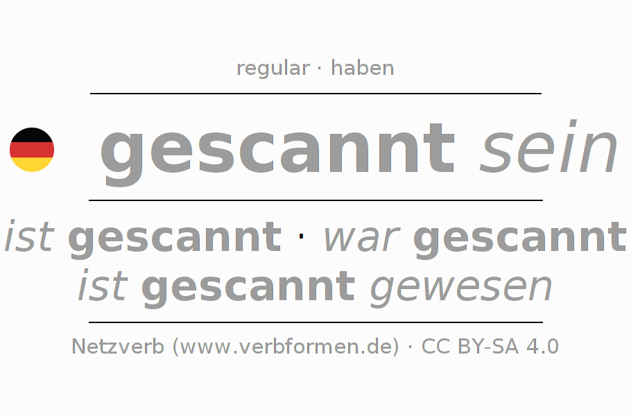 Ejemplos para la conjugación del infinitivo scannen. Aquí tenemos fragmentos de texto reales y oraciones tomadas del proyecto Tatoeba. Por cada tipo de conjugación hay un ejemplo y la forma verbal se encuentra destacada. A veces hay más de una oración, pero en ese caso se seleccionará automáticamente un ejemplo del verbo alemán en cuestión. Para que además de aprender también practiques la conjugación del verbo, tenemos para ti Arbeitsblätter und Übungen hojas de trabajo disponibles.