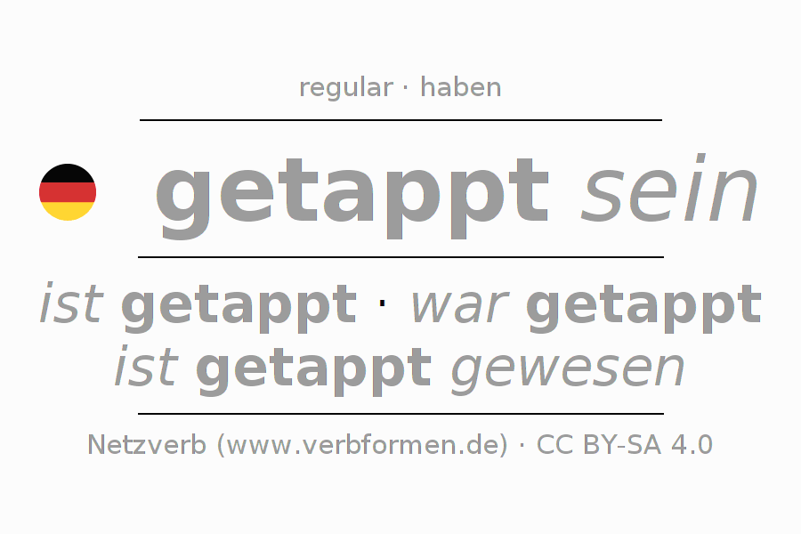 Ejemplos para la conjugación del infinitivo tappen. Aquí tenemos fragmentos de texto reales y oraciones tomadas del proyecto Tatoeba. Por cada tipo de conjugación hay un ejemplo y la forma verbal se encuentra destacada. A veces hay más de una oración, pero en ese caso se seleccionará automáticamente un ejemplo del verbo alemán en cuestión. Para que además de aprender también practiques la conjugación del verbo, tenemos para ti Arbeitsblätter und Übungen hojas de trabajo disponibles.