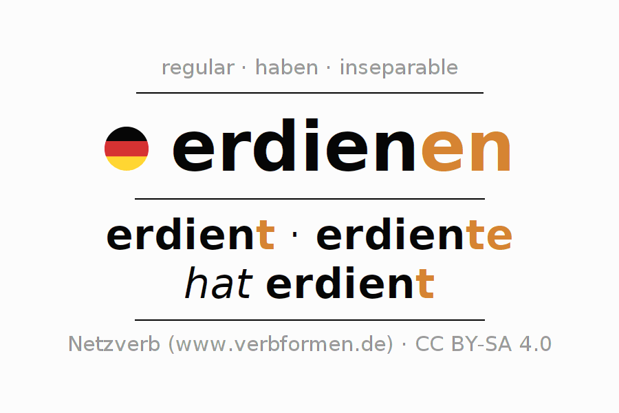 - Pasado perfecto: ich habe erdient, du hast erdient, er hat erdient, wir haben erdient, ihr habt erdient, sie haben erdient