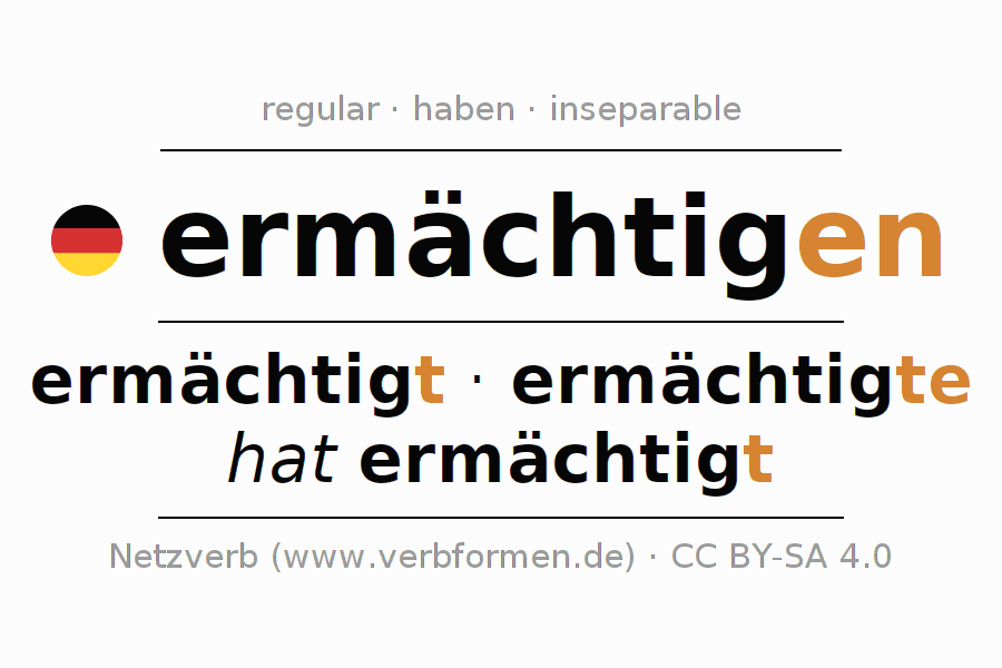 - Pasado perfecto: ich habe ermächtigt, du hast ermächtigt, er hat ermächtigt, wir haben ermächtigt, ihr habt ermächtigt, sie haben ermächtigt