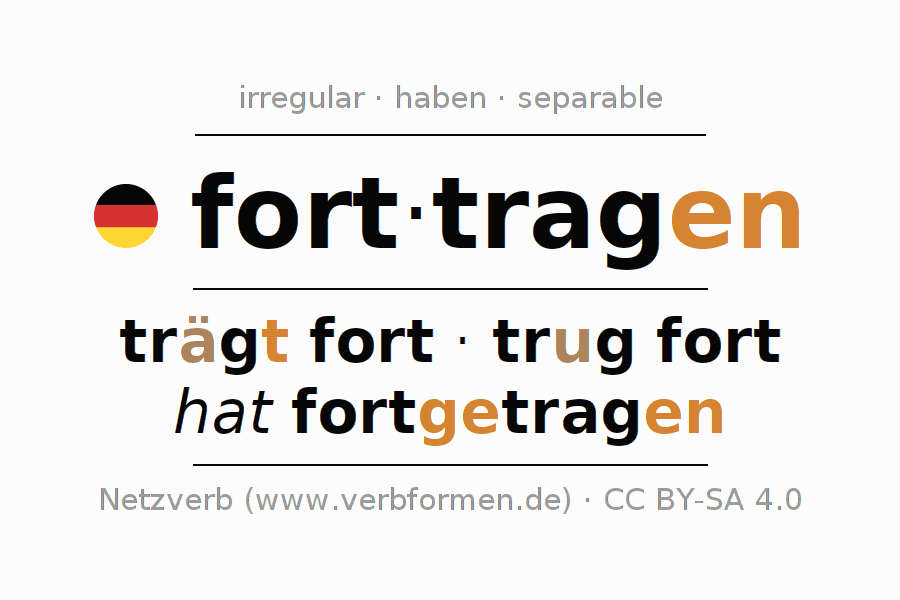 - Presente: ich trag(e) fort, du trägst fort, er trägt fort, wir tragen fort, ihr tragt fort, sie tragen fort