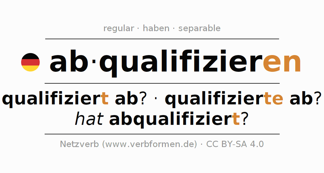 Tablas de verbos para la conjugación de ab·qualifizieren en línea, representadas de forma simple, con todas las construcciones verbales en singular y plural, en todas las personas gramaticales (1ª persona, 2ª persona, 3ª persona). El practicar la conjugación del verbo ab·qualifizieren es útil para tareas, exámenes, la escuela, la universidad, las clases de alemán y para los estudiantes adultos. Especialmente para los estudiantes del alemán es muy importante el conjugar los verbos y el formar las raíces verbales de forma correcta. Aquí encuentras más información acerca del tema Wiktionary abqualifizieren und unter abqualifizieren im Duden.