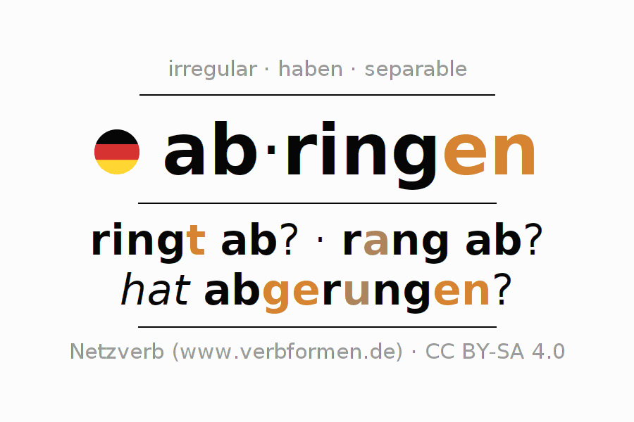 - Presente: ring(e) (du) ab, ringen wir ab, ringt (ihr) ab, ringen Sie ab