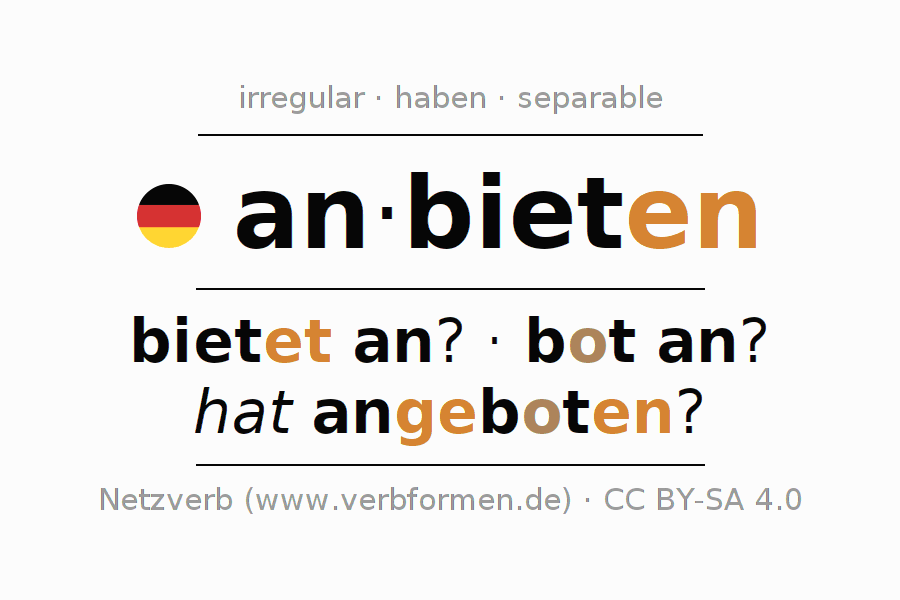 - Presente: biete ich an?, bietest du an?, biete er an?, bieten wir an?, bietet ihr an?, bieten sie an?