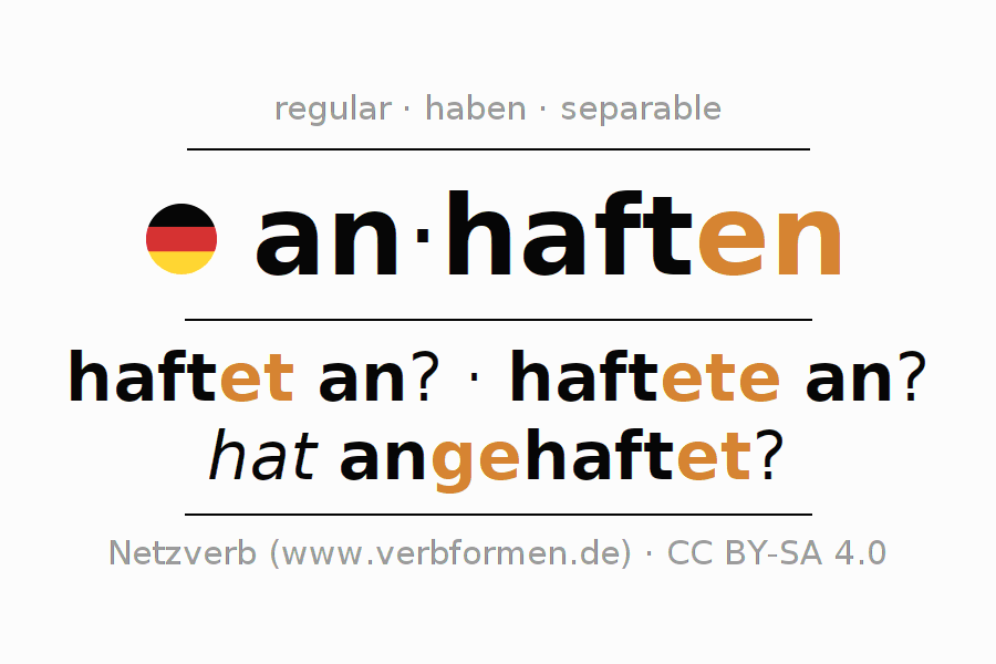 - Pasado perfecto: habe ich angehaftet?, hast du angehaftet?, hat er angehaftet?, haben wir angehaftet?, habt ihr angehaftet?, haben sie angehaftet?