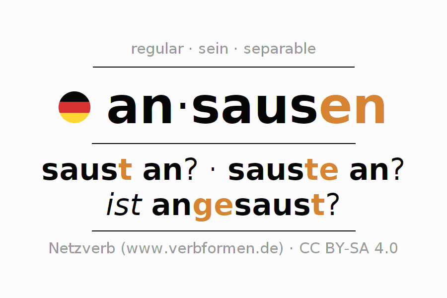 - Presente: sause ich an?, sausest du an?, sause er an?, sausen wir an?, sauset ihr an?, sausen sie an?