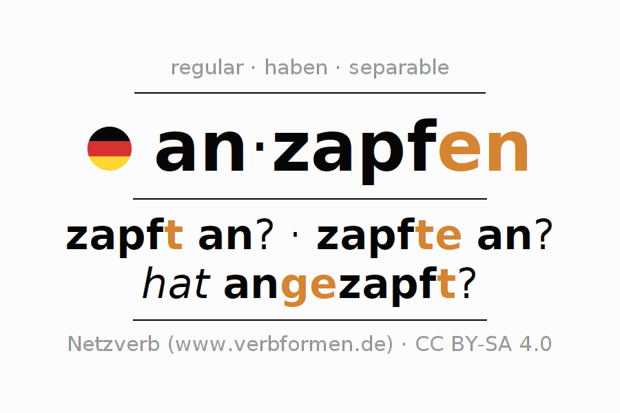 - Presente: zapf(e) (du) an, zapfen wir an, zapft (ihr) an, zapfen Sie an