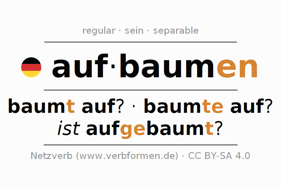 - Presente: baum(e) (du) auf, baumen wir auf, baumt (ihr) auf, baumen Sie auf