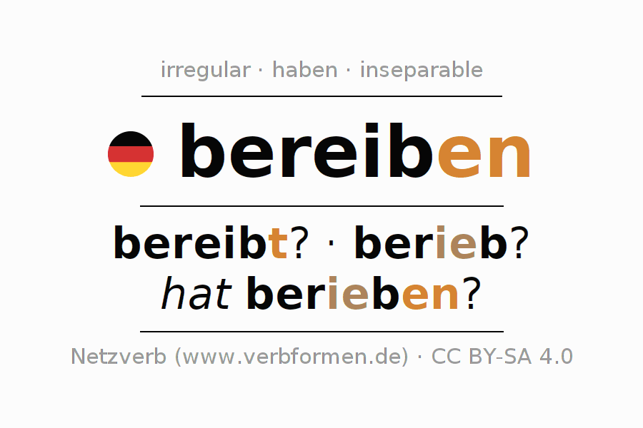 - Presente: bereib(e) ich?, bereibst du?, bereibt er?, bereiben wir?, bereibt ihr?, bereiben sie?