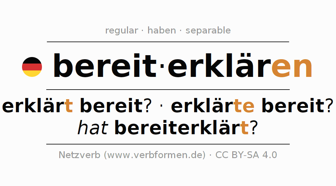 - Pasado perfecto: habe ich bereiterklärt?, hast du bereiterklärt?, hat er bereiterklärt?, haben wir bereiterklärt?, habt ihr bereiterklärt?, haben sie bereiterklärt?