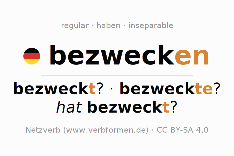 - Pretérito: bezweckte ich?, bezwecktest du?, bezweckte er?, bezweckten wir?, bezwecktet ihr?, bezweckten sie?