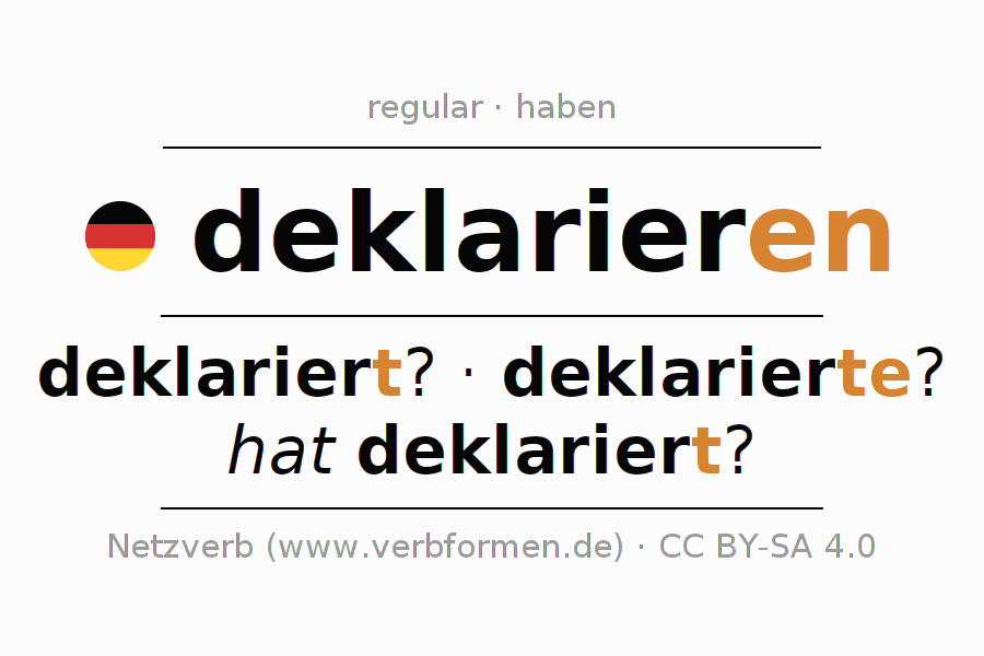 Tablas de verbos para la conjugación de deklarieren en línea, representadas de forma simple, con todas las construcciones verbales en singular y plural, en todas las personas gramaticales (1ª persona, 2ª persona, 3ª persona). El practicar la conjugación del verbo deklarieren es útil para tareas, exámenes, la escuela, la universidad, las clases de alemán y para los estudiantes adultos. Especialmente para los estudiantes del alemán es muy importante el conjugar los verbos y el formar las raíces verbales de forma correcta. Aquí encuentras más información acerca del tema Wiktionary deklarieren und unter deklarieren im Duden.