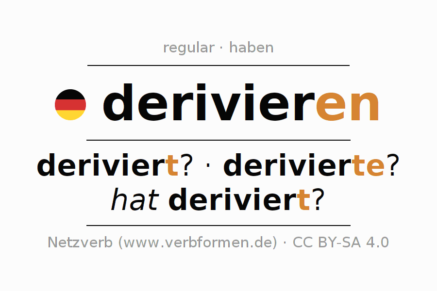 Tablas de verbos para la conjugación de derivieren en línea, representadas de forma simple, con todas las construcciones verbales en singular y plural, en todas las personas gramaticales (1ª persona, 2ª persona, 3ª persona). El practicar la conjugación del verbo derivieren es útil para tareas, exámenes, la escuela, la universidad, las clases de alemán y para los estudiantes adultos. Especialmente para los estudiantes del alemán es muy importante el conjugar los verbos y el formar las raíces verbales de forma correcta. Aquí encuentras más información acerca del tema Wiktionary derivieren und unter derivieren im Duden.