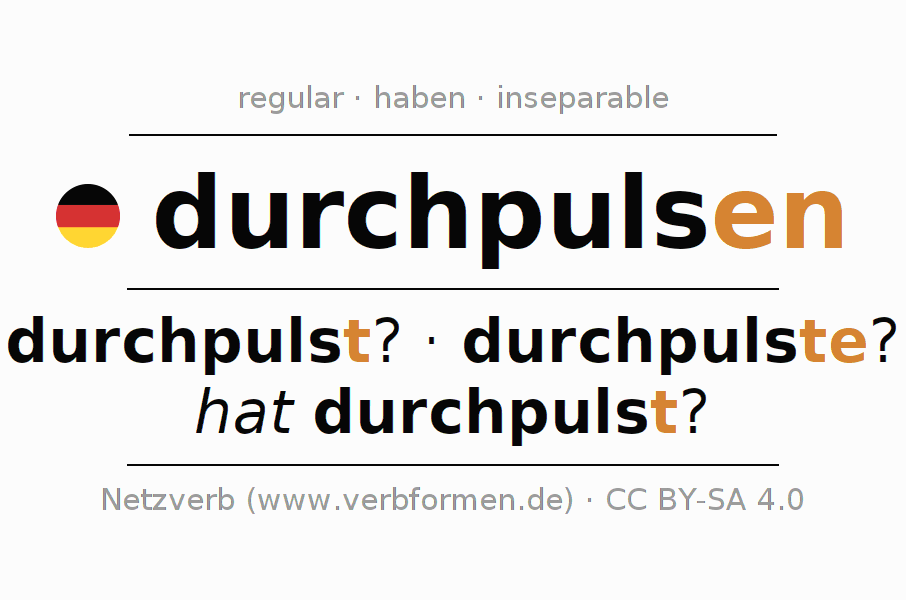 - Pretérito: durchpulste ich?, durchpulstest du?, durchpulste er?, durchpulsten wir?, durchpulstet ihr?, durchpulsten sie?