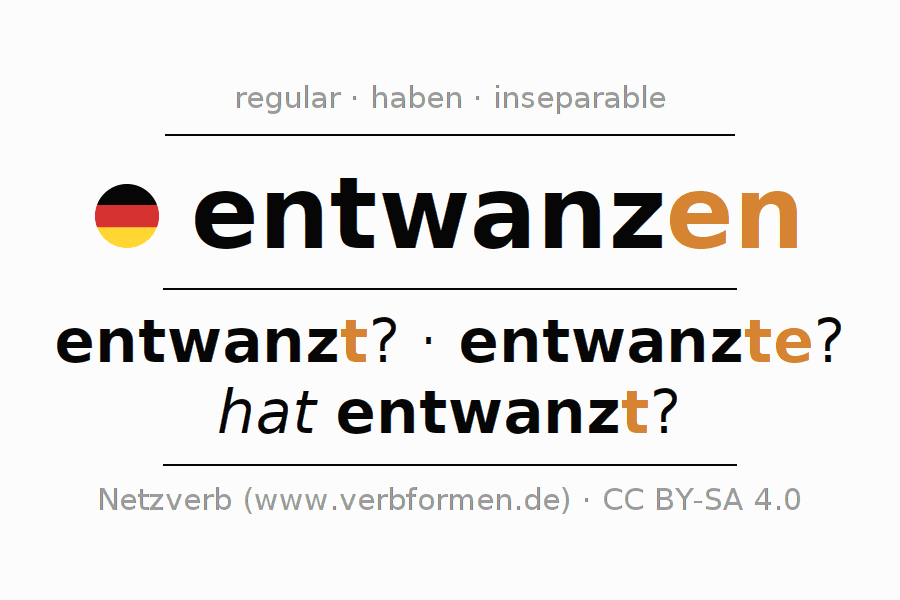 - Presente: entwanz(e) ich?, entwanzt du?, entwanzt er?, entwanzen wir?, entwanzt ihr?, entwanzen sie?