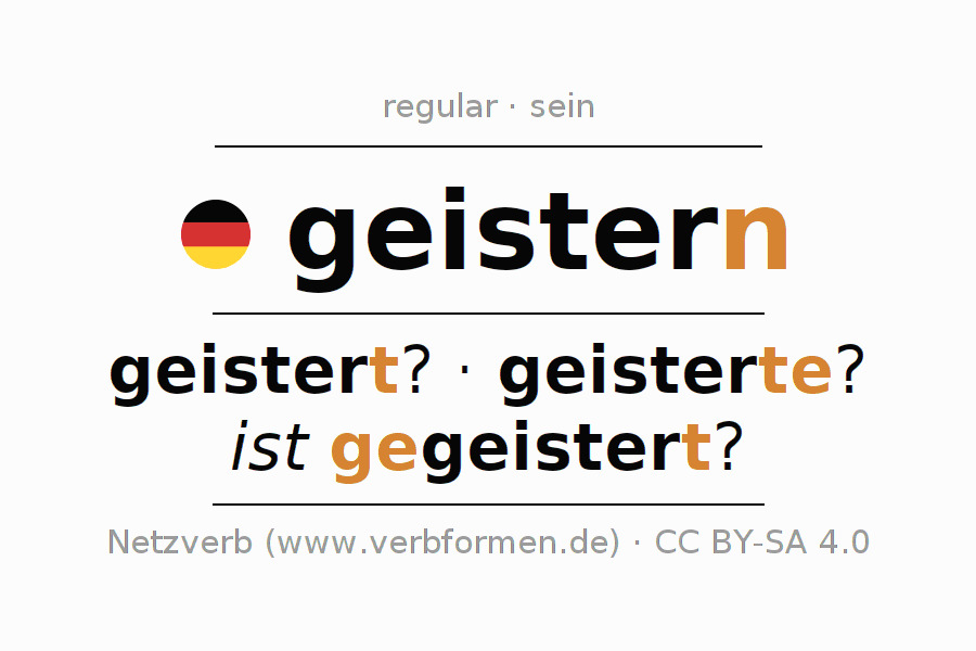 - Pretérito: geisterte ich?, geistertest du?, geisterte er?, geisterten wir?, geistertet ihr?, geisterten sie?