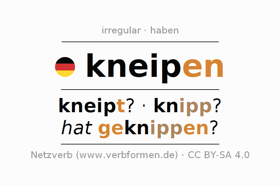 - Presente: kneip(e) (du), kneipen wir, kneipt (ihr), kneipen Sie