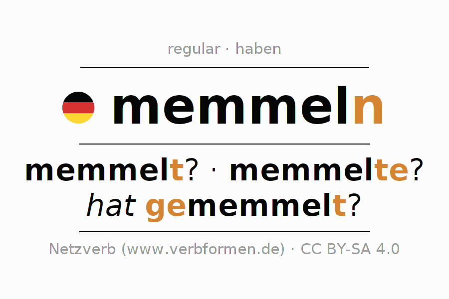 - Pretérito: memmelte ich?, memmeltest du?, memmelte er?, memmelten wir?, memmeltet ihr?, memmelten sie?