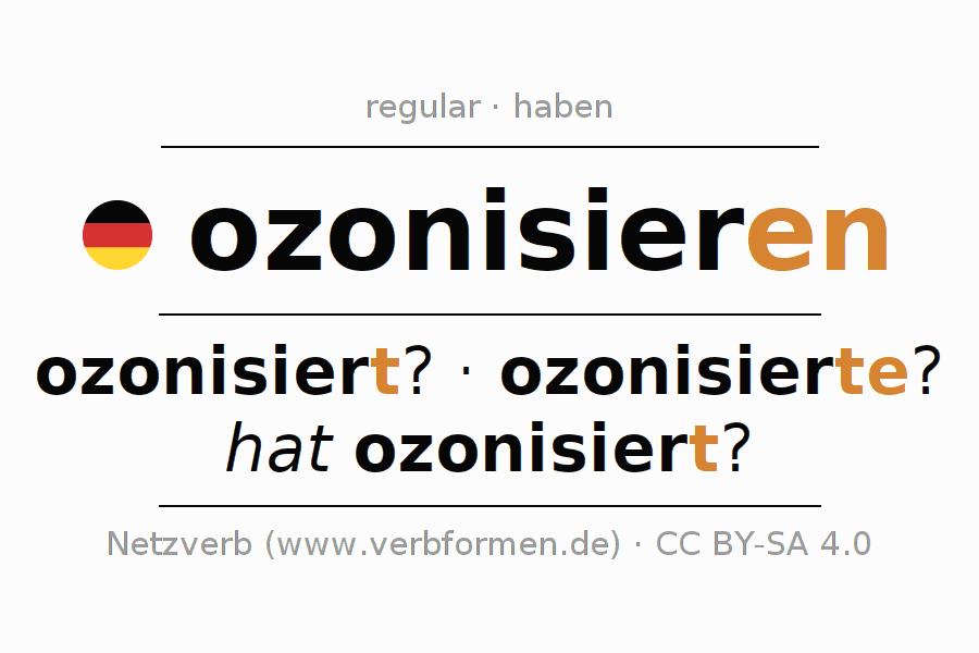 - Pretérito: ozonisierte ich?, ozonisiertest du?, ozonisierte er?, ozonisierten wir?, ozonisiertet ihr?, ozonisierten sie?