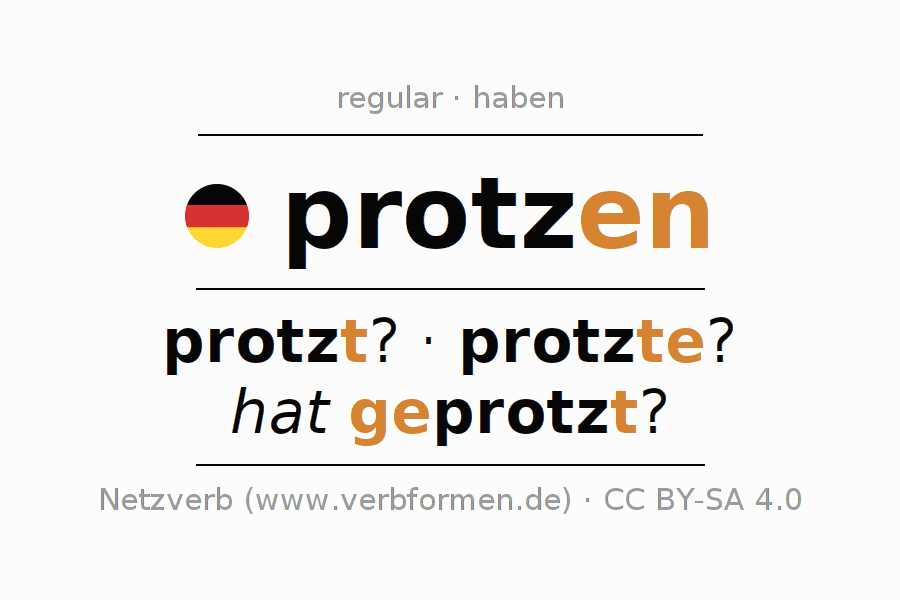 - Pasado perfecto: habe ich geprotzt?, hast du geprotzt?, hat er geprotzt?, haben wir geprotzt?, habt ihr geprotzt?, haben sie geprotzt?